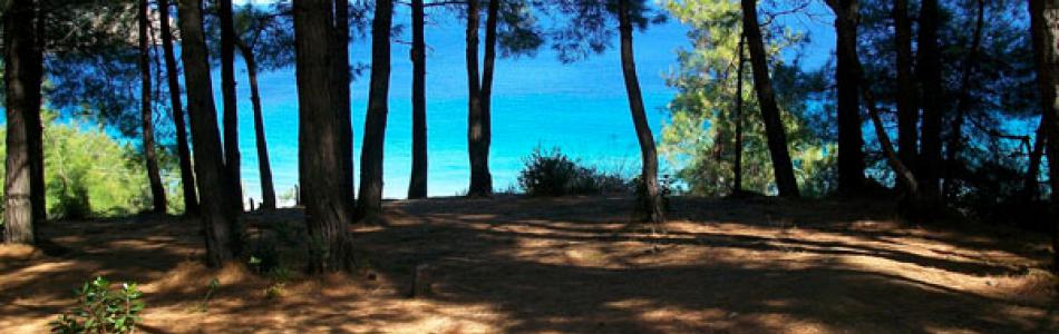 The beach is easily accessible and there are three parking areas. You can park next to the main road or follow the two dirt roads that lead to the two ends of the beach. The pine trees go all the way down to the beach offering their shade to the bathers.